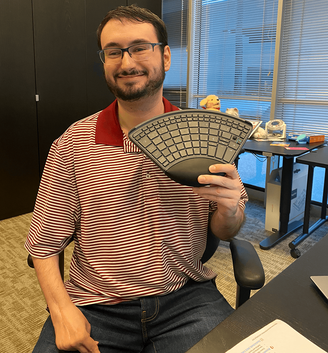 A client of the Texas Technology Access Program demonstrates a one-handed keyboard he acquired to help perform tasks required for a potential job.